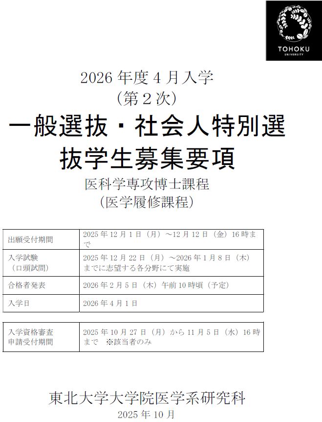 October 27, 2025 東北大学大学院医科学専攻の2次募集が始まります